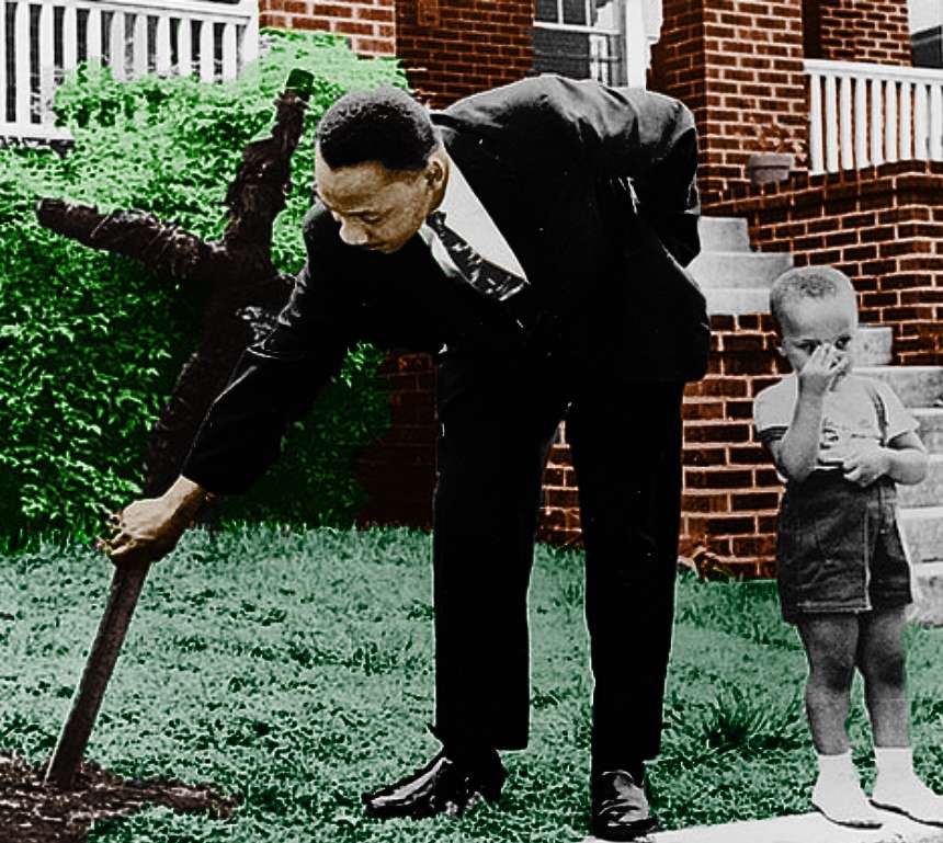 In this photo, you can see Martin Luther King Jr. Removing a burnt cross from his yard as his young son Martin Luther King III looks on.  I decided not to add color to the child as I did the rest of the photo.   The reason is that here we see MLK seemingly unfazed removing this symbol of hatred from his yard while speaking to his son.  Unfortunately, the great MLK was not able to pass down all of life’s lessons to his son as he was soon after martyred.  Much of the wisdom of this great man would soon be lost.  Within living memory, so many big names of history had tried to force the United States to look at itself in the mirror, Adolf Hitler, Joeseph Stalin, Nikita Khrushchev, and Leonid Brezhnev the United States never yield, it was the son of a rural Georgia pastor who forced the nation to look within to move forward on the stalled promises dating back to the Civil War.  With the death of MLK there is no doubt a nation, and the world lost a voice of reason, a voice of peace, a voice of unrelenting Faith in humanity that while he shined briefly, it was truly with the radiatance of a thousands sons.