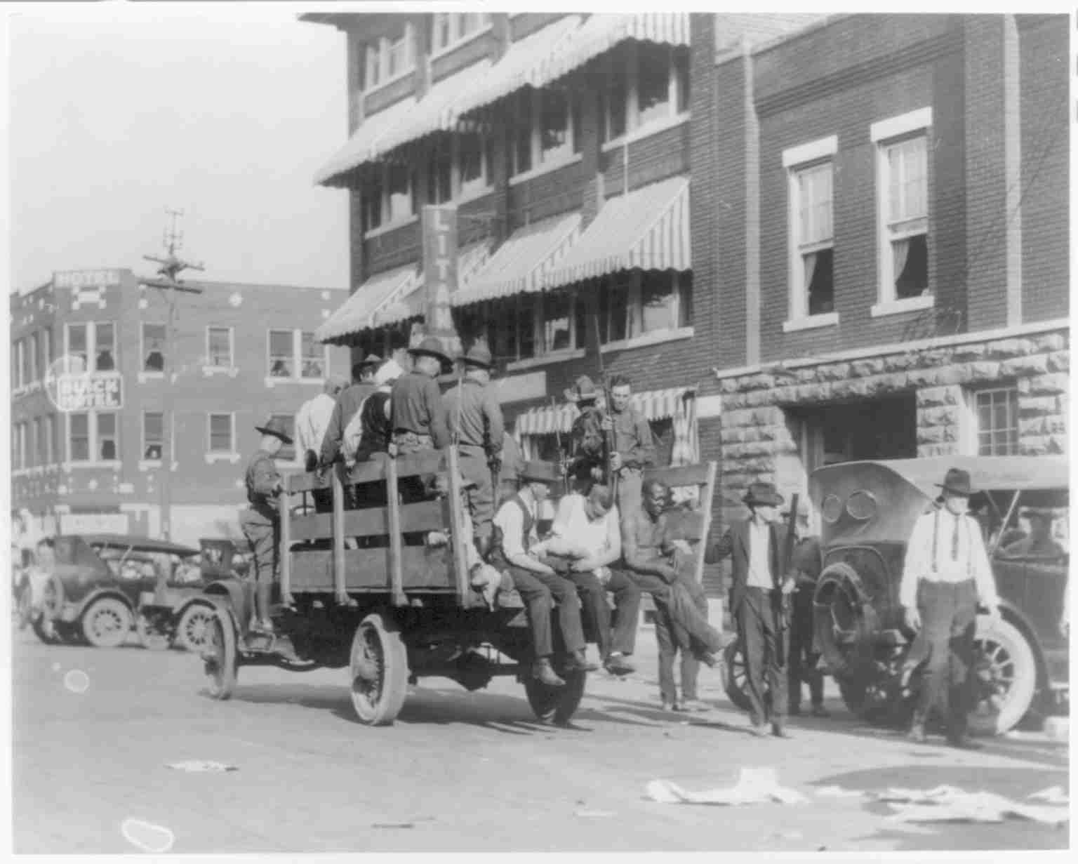 This photo is from the 1921 Tulsa Race  Massacre.  While some have attempted to downplay what happened over the years, the facts are simple.  Hysteria grew among white residents of a black uprising, in response to the specter, to the illusion, of the “uprising” on the morning of June 1st, 1921 thousands of whites descended on the Greenwood neighborhood and burned and looted 35 blocks of black-owned businesses and homes.  This action, as shown in this photo, was aided and supported by the white police force that arrested black citizens.  In all, 1256 homes were torched, as well as a library, school, and numerous churches and businesses.  Estimates put the death toll at over 300 people.  When the national guard arrived on June 2nd the rioting ceased with the presence of the military, they put out the fire but also aided in holding 6000 black residents at the fairground to “restore order”.  No official public acknowledgment was given until the 75th anniversary in 1996.